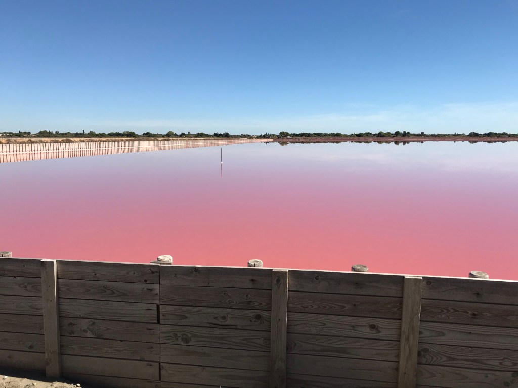 Comme vous pouvez le voir sur la photo précédente, l’eau est rose. C’est du à une algue qui sera enlevée lors des récoltes du sel. Celle-ci ce fait manuellement encore aujourd’hui.