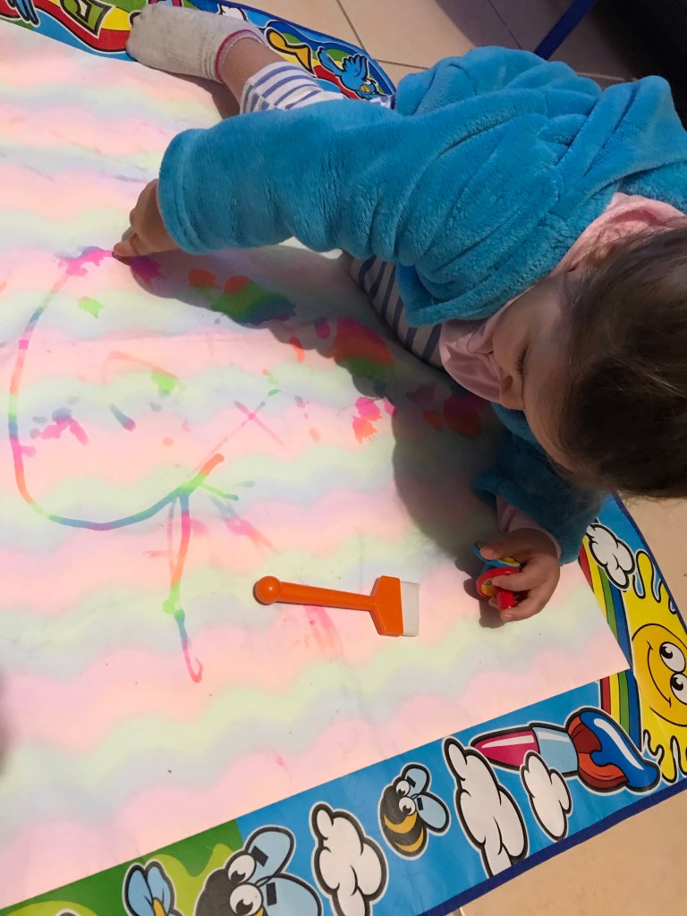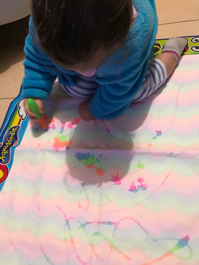 Pour ceux qui ne connaissent pas ce sont des feutres que l’on remplit d’eau. L’enfant dessine sur son tapis et fait apparaître des motifs, des lettres et tout ce qui lui passe par la tête. Nous pouvons les réutiliser à l’infini.