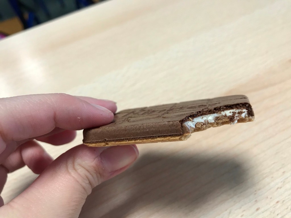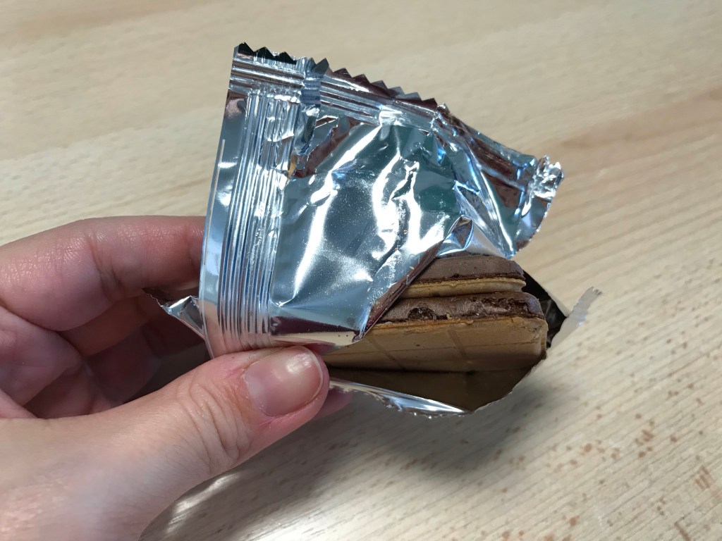 Chaque gâteau ce compose de deux petites gaufres très fines et légères. On retrouve un côté au goût de cacao en poudre et l’autre côté je dirais que c’est nature. A l’intérieur on y trouve une mini couche de « lait » qui rappelle le goût des choco kinder.