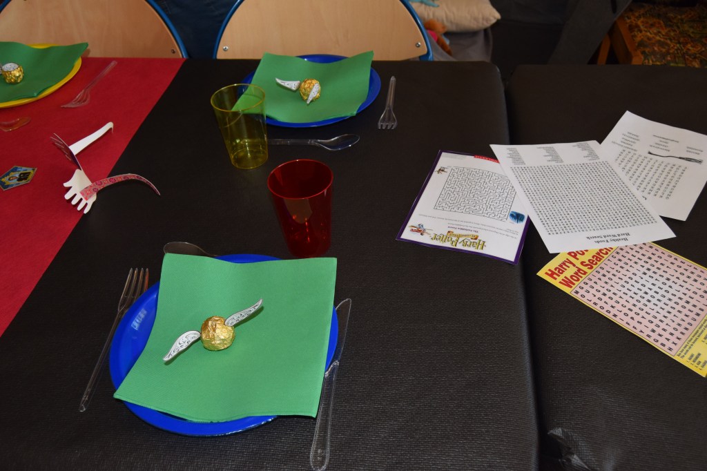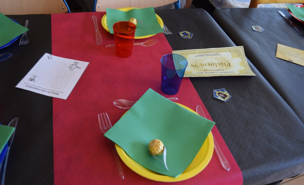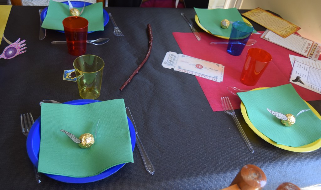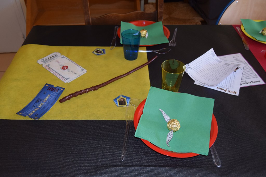 Sur la table, j’ai mis une nappe noire, des chemins de table rouge et jaune et quelques petites décos. J’ai posé des verres et des assiettes rouge, bleu et jaune, des serviettes vertes, le tout aux couleurs des maisons de Poudlard.